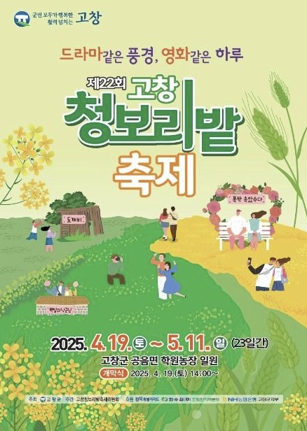 '드라마 같은 풍경, 영화 같은 하루'라는 테마로 진행하는 고창 청보리밭 축제는 올해로 22번째 진행하는 축제라고 하는데요!