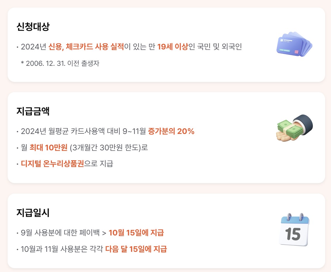 - 지급 시기: 소비 증가 확인 후 다음 달 15일부터 순차 지급