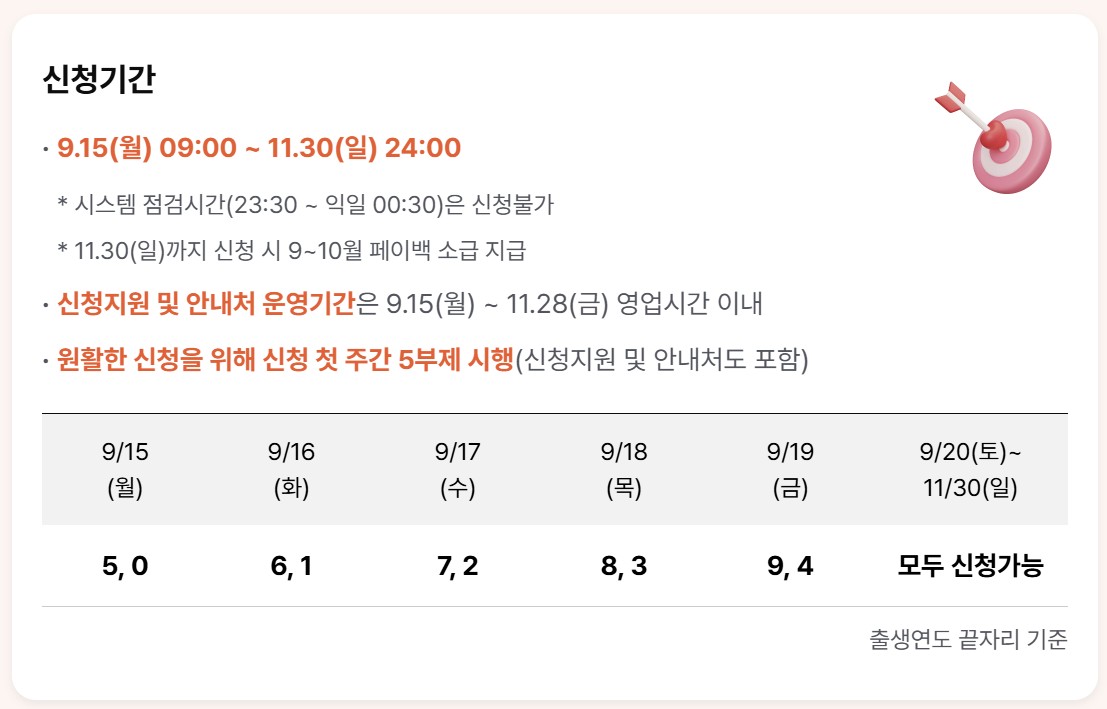 - 신청 첫 주(9/15~9/19)는 출생연도 끝자리 기준 5부제 운영
